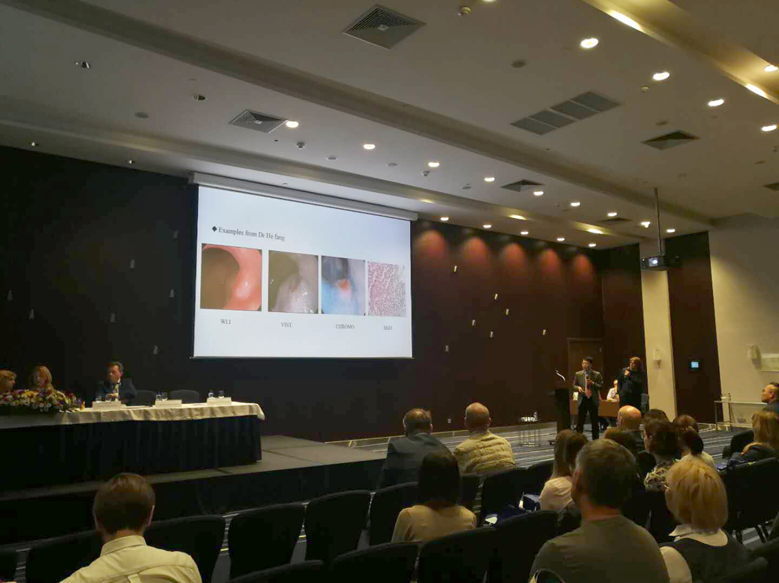 李鵬教授分享了關(guān)于染色技術(shù)對消化道早期癌發(fā)現(xiàn)的應(yīng)用及重要性,并向全體與會人員介紹并認可中國高清電子內(nèi)鏡HD–500,及其光電復(fù)合染色技術(shù)VIST的臨床應(yīng)用和價值,現(xiàn)場反響熱烈,紛紛提問。李鵬教授專業(yè)的解答與分享受到現(xiàn)場與會俄羅斯專家及醫(yī)護人員的認可并報以熱烈的掌聲。