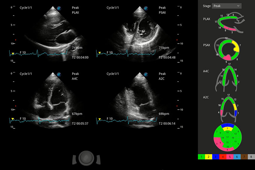 實(shí)時用顏色表示心肌組織運(yùn)動,觀察和定量組織的運(yùn)動情況,對快速檢測與評估心肌的灌注和活性、電傳導(dǎo)及心肌收縮和舒張功能等均能提供重要的診斷信息。