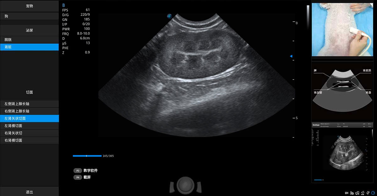 提供解剖示意圖、標(biāo)準(zhǔn)超聲圖像、掃查手法圖和操作者實(shí)時檢查圖像,指導(dǎo)操作者進(jìn)行標(biāo)準(zhǔn)切面的正確掃查。